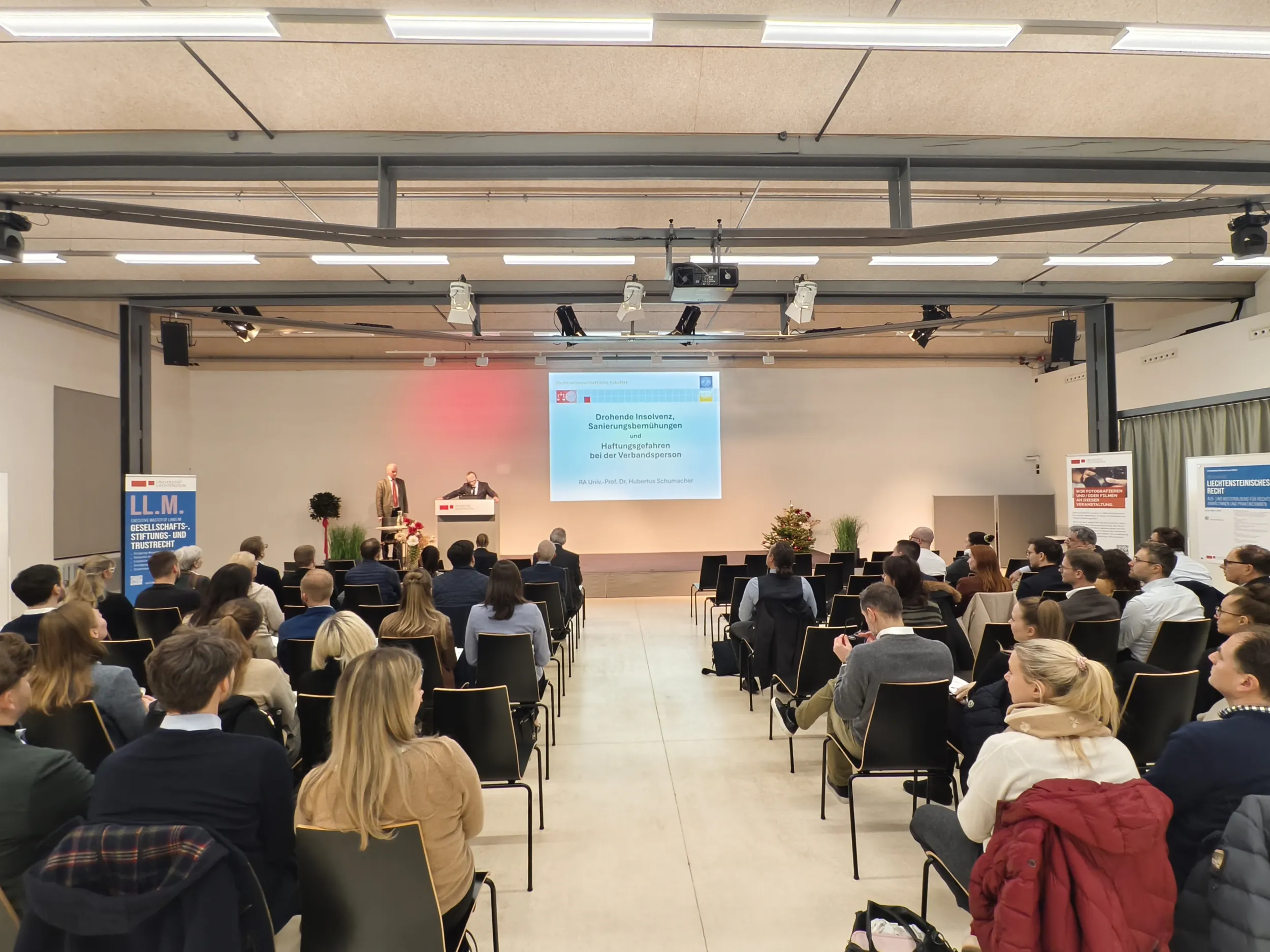 Am 4. Dezember 2025 lud die Professur für Gesellschafts-, Stiftungs- und Trustrecht im Rahmen des gleichnamigen Executive Master of Laws (LL.M.) zu einem Themenabend mit dem Titel «Drohende Insolvenz, aussergerichtliche Sanierungsversuche und Haftungsgefahren bei der Verbandsperson» in das Auditorium der Universität Liechtenstein ein. Vor rund fünfzig Teilnehmenden referierte RA Univ.-Prof. Dr. Hubertus Schumacher, Präsident des Fürstlichen Obersten Gerichtshofs, über Besonderheiten des liechtensteinischen Insolvenzrechts und teilte exklusiv seine praktischen Erfahrungen.